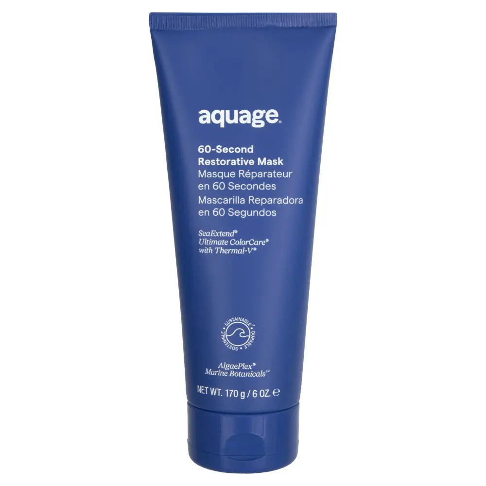 This deeply restorative mask is formulated for anyone with dry, damaged, lightened, or color-treated hair that needs a boost of hydration and strength. The Aquage 60-Second Restorative Mask contains replenishing body-building Wheat proteins that help to seal down the hair's cuticle to improve shine, elasticity, and smoothness. These Wheat Proteins also help to strengthen each hair strand, fight off frizz, and reduce breakage in hair for overall healthier hair with each use. Formulated with Aquage's signature AlgaePlex Marine Botanicals that instantly help to hydrate, strengthen, smooth, and protect your hair. These Microalgae restore softness to your hair and soothe your scalp as well. Ideal for use after color-treating your hair, the Aquage 60-Second Restorative Mask leaves you with stunning hair that is bursting with shine!