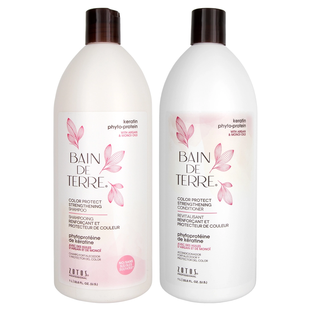 Cleanse and strengthen weak, damaged, or fragile hair while the Bain de Terre Keratin Phyto-Protein Color Protecting Strengthening Shampoo & Conditioner Duo replenishes hair's natural proteins.