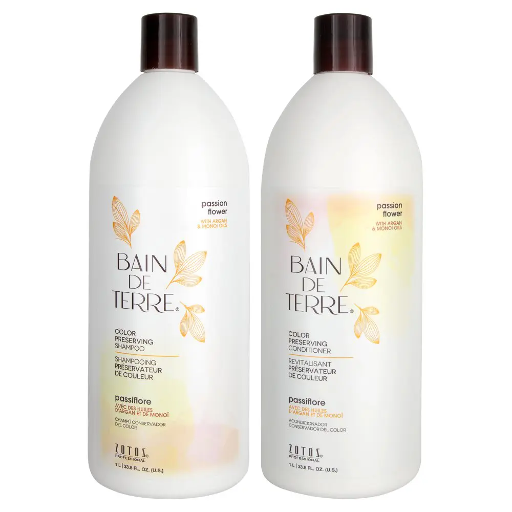 Don't miss out on this super savings deal with the Passion Flower Color Preserving Shampoo & Conditioner Duo. This liter duo preserves the vibrancy of color-treated hair by over 85%. The Bain de Terre Passion Flower Color Preserving Shampoo is a rich conditioning shampoo that is ideal for all hair types and textures. Paired with the Bain de Terre Passion Flower Color Preserving Conditioner shields hair from environmental stressors that dull and fade out hair color vibrancy. This duo is formulated with the power of potent, natural botanicals to nourish, revitalize, and protect hair to keep it strong, healthy, lustrous, vibrant, and shiny. These botanicals include passion flower, argan oil, and monoi oil. Passion Flower Seed Oil moisturizes dry hair and its anti-inflammatory properties can help to treat a dry, irritated scalp. Argan oil deeply moisturizes hair, adds shine, protects hair color, and also protects from breakage, and increases elasticity. Monoi oil helps with split ends, frizz, dullness, and brittleness.