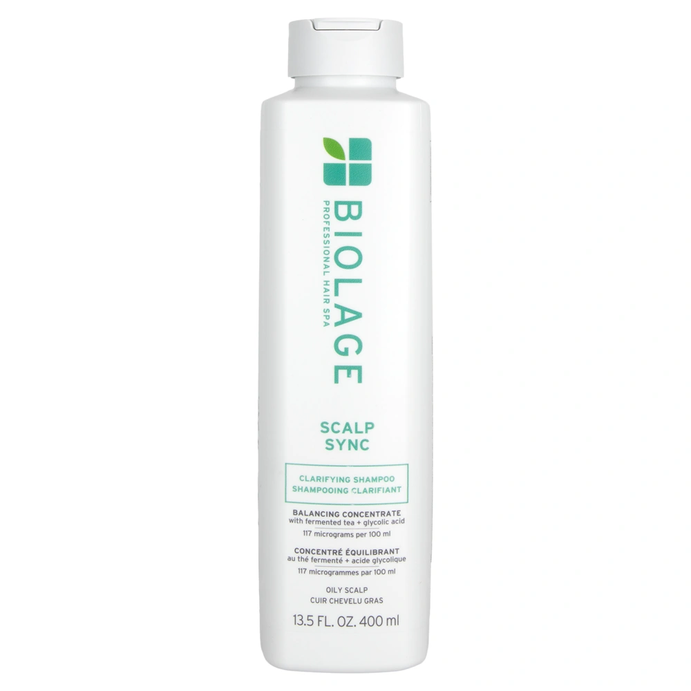 The Biolage Scalp Sync Clarifying Shampoo is an ultra-gentle clarifying shampoo formulated for those with oily scalps. This shampoo is infused with fermented tea and glycolic acid to help balance the scalp's moisture levels while also helping to restore volume, shine, and lift to the hair. The Biolage Scalp Sync Clarifying Shampoo gently washes away hair impurities without stripping the hair and scalp of its natural and essential oils. Fermented Tea helps to balance the pH levels within the hair fiber and scalp while also providing the scalp with anti-inflammatory benefits. Glycolic acid helps remove dead and dehydrated skin cells from the scalp and improves scalp circulation. Dead skin cells can clog the hair follicle, leading to dandruff and other scalp issues. The Biolage Scalp Sync Clarifying Shampoo is vegan, cruelty-free, and free from parabens, silicones, mineral oils, and artificial colorants.
