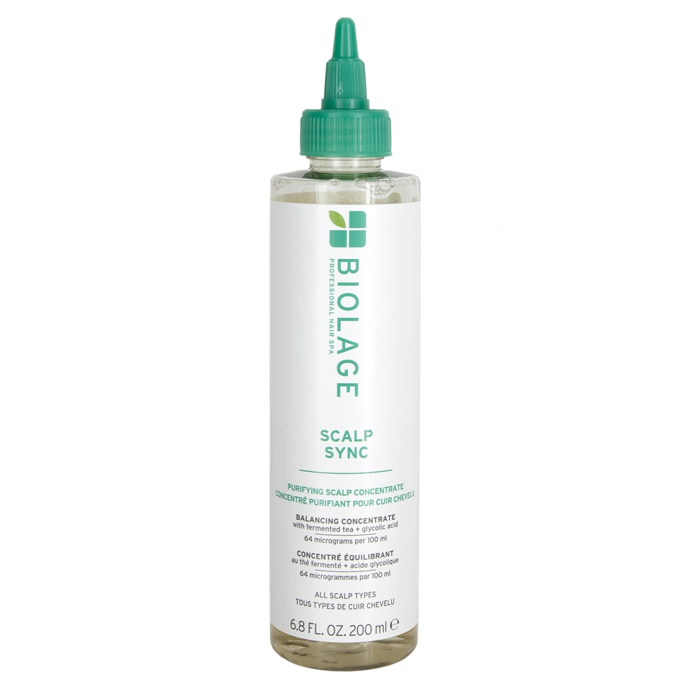 The Biolage Scalp Sync Purifying Scalp Concentrate is a pre-shampoo treatment that gently exfoliates and clarifies the scalp. It helps to remove build-up from the scalp of excess oil, impurities, and dead skin after one single use. This treatment is infused with glycolic acid and fermented tea. Glycolic Acid is both clarifying and balancing to the scalp. It helps to increase cell turnover to remove product buildup and dead cells that can distribute the healthy function of the hair follicle. Additionally, glycolic acid helps to boost hairs moisture from within. Paired with calming fermented tea, which features a powerful combination of antioxidants from fermented black tea and the antioxidant properties of green tea. These both help reduce scalp irritation and itchiness. The Biolage Scalp Sync Purifying Scalp Concentrate is ideal for all scalp types and is the ideal first step in the Biolage Scalp Sync System.