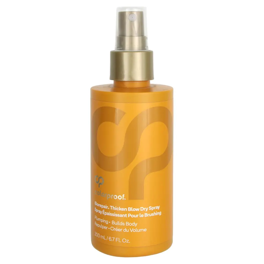 The ColorProof BioRepair Thicken Blow Dry Spray is a weightless, heat-activated blow dry spray that adds volume to your hair and increases the thickness in diameter of each hair strand. Made with BioRepair-8's active ingredients to deliver nourishment to your hair and scalp to strengthen and protect against breakage. Has heat protection up to 450 degrees and is color-safe. The ColorProof BioRepair Thicken Blow Dry Spray helps to reduce friction within the hair while also fortifying the hair and increasing tensile strength while protecting against breakage. It protects and prolongs the life of your hair color, keeping it looking fresh and vibrant. The key ingredients in this thickening spray are ColorProof's Advanced Color Last System, Hydrolyzed Corn Starch, Amino Acid Polymer Blend, and Phyto-CP Complex. The Advanced Color Last System features a proprietary blend of powerful proteins and potent antioxidants that repair, preserve, and protect against fading and environmental factors. Hydrolyzed Corn Starch helps to grip each individual hair fiber to increase density and provide weightless volume, while the Amino Acid Polymer Blend thickens each hair strand and provides a long-lasting soft hold. Lastly, ColorProof's Phyto-CP Complex which includes grape stem cells helps to preserve and promote a healthy scalp.