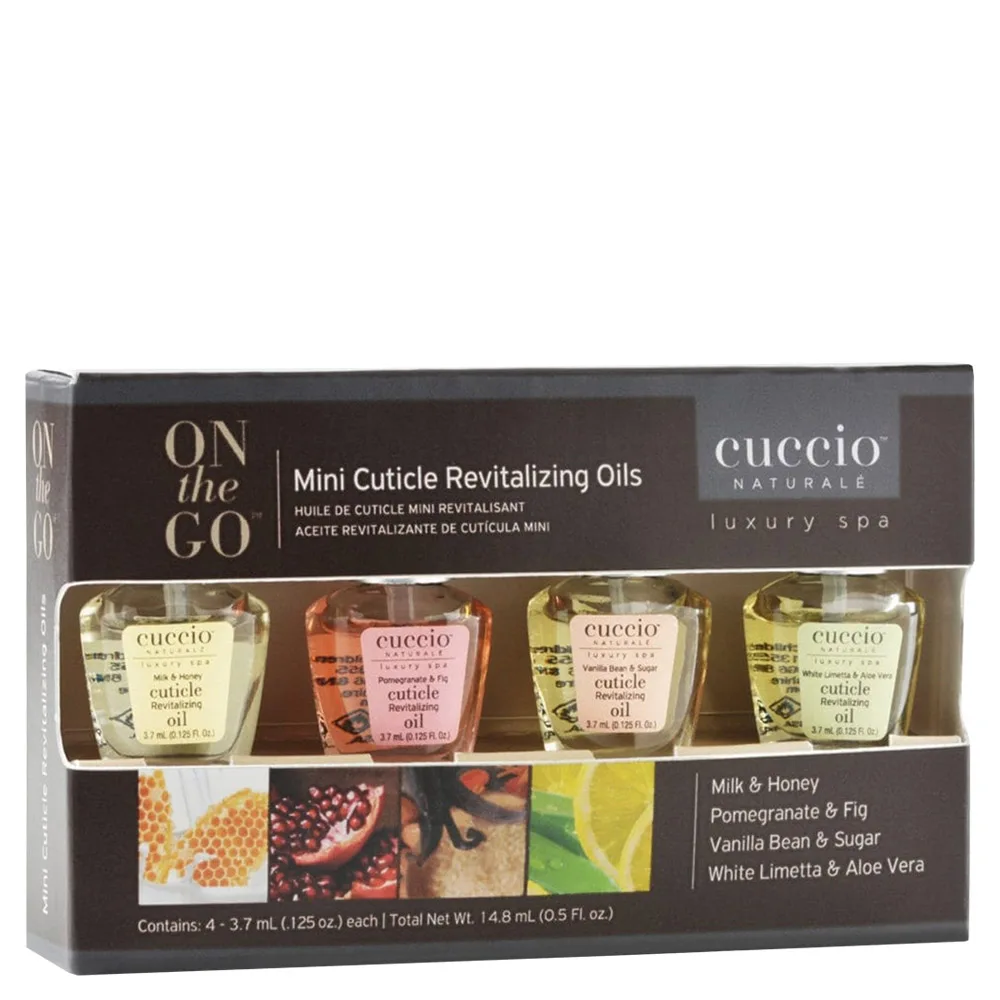 Provide the ultimate nourishment for dry cuticles with the Cuccio Naturale Mini Revitalizing Cuticle Oil Set. This set includes four different scented cuticle oils to fit your current mood. Formulated with naturally derived cold-pressed pure oils for quick absorption and rich hydration, leaving your cuticles nourished and smooth.