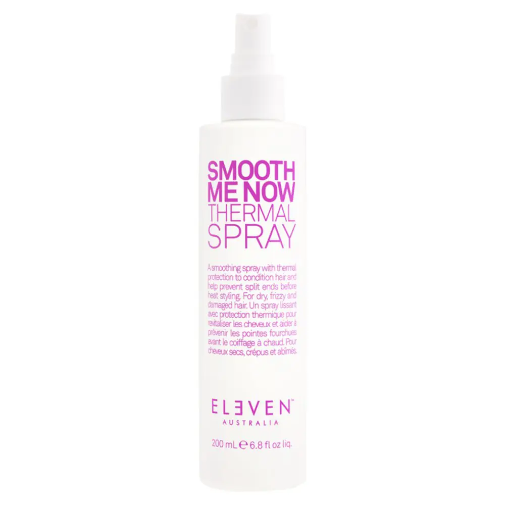 The Eleven Australia Smooth Me Now Thermal Spray is a must-have for any styling routine! This smoothing treatment with thermal protection deeply conditions the hair strands, helping to prevent split ends before you heat style. Its advanced formula is designed to provide heat protection, to improve frizz, and enhance the overall manageability of your hair. The Eleven Australia Smooth Me Now Thermal Spray helps to shield hair from the damaging effect of thermal styling, providing up to 428 degrees of protection. It forms a protective barrier around the hair strand, ensuring your hair will stay healthy and vibrant. This spray uses a unique blend of antioxidant-rich ingredients to help to smooth the hair's cuticle to leave strands sleek and polished. The Eleven Australia Smooth Me Now Thermal Spray uses argan oil to help moisturize the hair, while chamomile flower extract helps to promote both hair and scalp health. The hydrolyzed quinoa in this spray provides the hair with nourishment and incredible shine. Its weightless formula allows for this spray to be used in all hair types and textures, and features a delightful fragrance of coconut and lime.