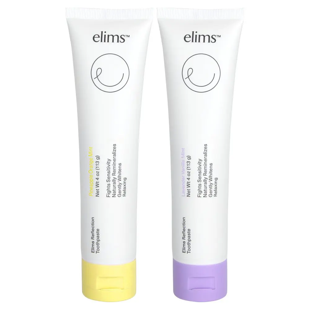 The Elims AM & PM Reflection Toothpaste Duo Set paired the Elims Pineapple Orange Mint Toothpaste with the Lavender Vanilla Mint Toothpaste to help you create the perfect morning and nightly brushing routine. These two tubes of toothpaste are naturally derived mineral toothpaste that was crafted by dentists. These toothpaste tubes are designed to remineralize your enamel and fight against tooth sensitivity. Harnessing the power of Xylitol, a plant-based antibacterial ingredient that deeply cleans teeth and promotes dental health while also reducing the signs of tooth decay and gum disease. While 10% nano-hydroxyapatite protects your teeth as a natural fluoride alternative, and baking soda and coconut oil gently whiten and brighten your teeth.