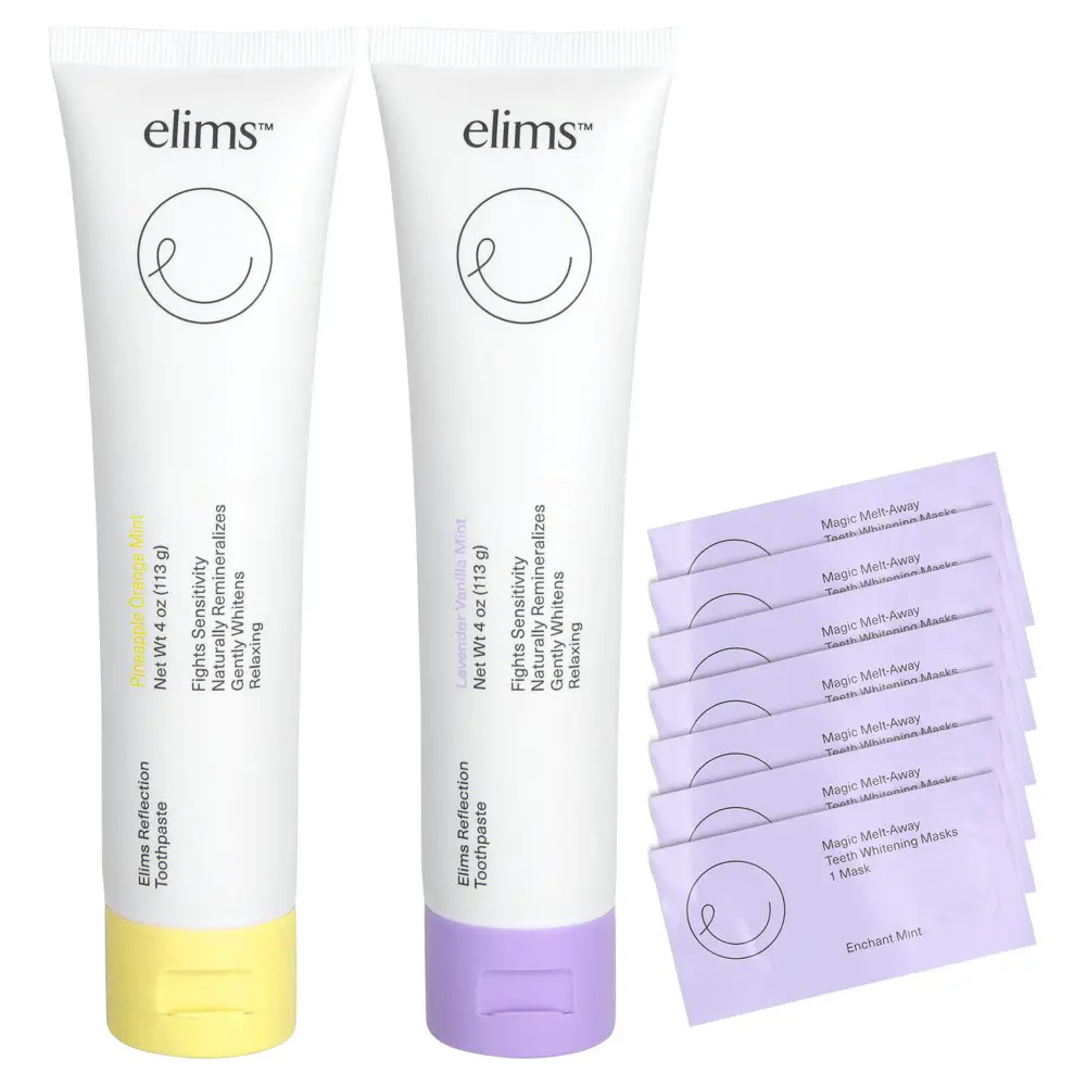The Elims AM & PM Reflection Toothpaste & Teeth Whitening Mask Set is the perfect daily oral care set. The Elims Reflection Toothpastes are meticulously crafted by dentists to enhance your oral well-being using naturally derived mineral ingredients. These toothpaste tubes are specially formulated to rejuvenate your enamel and combat tooth sensitivity. With the remarkable benefits of Xylitol, a plant-based antibacterial element, they effectively cleanse teeth, promote dental health, and diminish the indications of tooth decay and gum disease. Embracing the power of 10% nano-hydroxyapatite, a natural fluoride substitute, these toothpastes shield your teeth while gently whitening and illuminating them through the gentle action of baking soda and coconut oil. The Magic Melt-Away Teeth Whitening Masks gently lift away unwanted stains and yellowness to your teeth while also helping to keep your tooth enamel safe in the process. These extraordinary teeth-whitening masks are designed to brighten your teeth by up to seven shades with regular use. These masks effortlessly dissolve from your teeth in just 15 minutes once the whitening treatment is finished. Specially crafted for individuals with sensitive teeth, these masks offer professional-grade whitening effects without causing any tooth sensitivity.