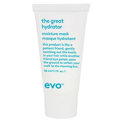 Evo The Great Hydrator Moisture Mask will calm the frizz, add loads of moisture and extra manageability simultaneously. This intense moisture-rich hair mask deeply hydrates, strengthens, and improves the manageability and shine of dry hair. It is formulated with glycerin and argan oil to deliver incredible moisture directly to the hair's cuticle, creating hair strands that are visibly softer, shinier, and easy to detangle.
