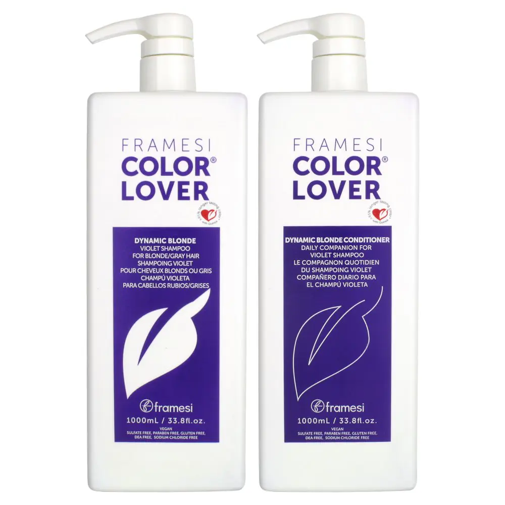 Give your blondes, highlights or gray a Beautiful ''Pick Me Up" with the Framesi Color Lover Dynamic Blonde Violet Shampoo & Conditioner Set. Specially designed to brighten gray, brassy, or highlighted hair. The Framesi Color Lover Dynamic Blonde Set gently removes mineral and styling build-up on all hair types. It's natural conditioning agents and vitamins penetrate the cuticle to protect as it cleans. Keeps your hair color 95% longer and leaves hair silky smooth.