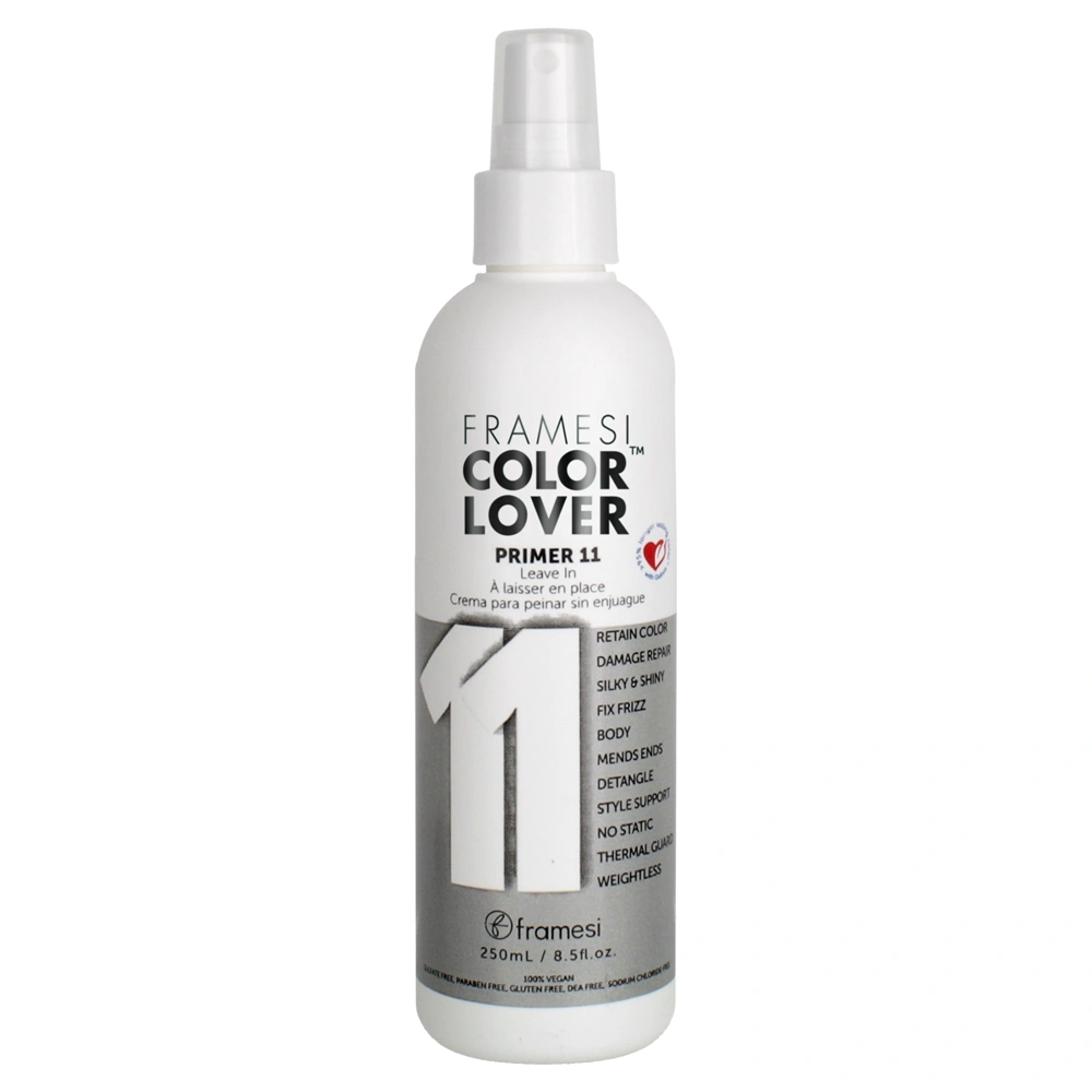 The Framesi Primer 11 is your hair's hero - the ultimate love of your life. It is enriched with Quinoa, an all-natural plant protein that leaves your hair and color shiny and brilliant. This leave-in conditioner will help you keep your hair color looking fresh and vibrant up to 95% longer and uses powerful anti-aging properties, as well as UV and thermal protectants to keep your hair healthy and happy. It features an ultra-weightless formula that never builds up on the hair strand and can be used in the hair both wet or dry! It provides the hair with 11 different benefits that truly make your hair look and feel better with each and every use.
