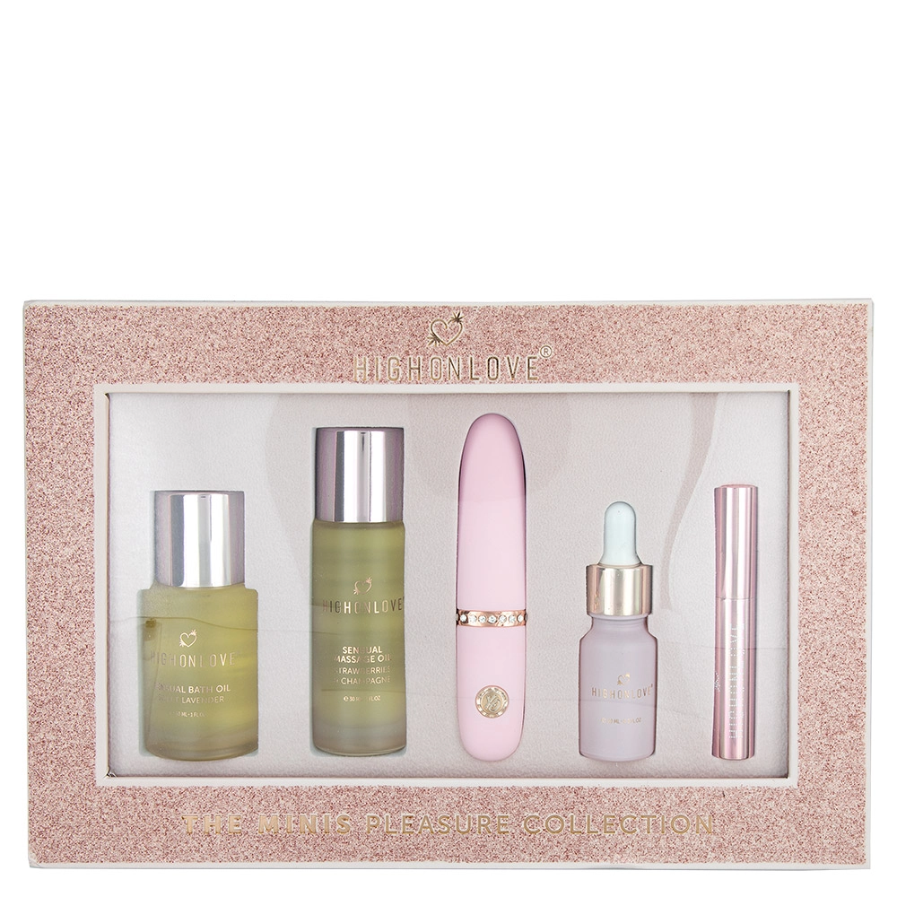 The High On Love The Minis Pleasure Collection allows you to treat yourself (or someone else) to the ultimate pleasure experience. This best-seller set helps to relax and pamper your skin with the Sensual Bath Oil in the fragrance Sweet Lavender and the Sensual Massage Oil Strawberries & Champagne fragrance. Then, elevate your foreplay game with the High On Love Plumping Couples Lip Gloss. This gloss not only helps to plump the lips but also gives a tingling sensation that transfers to wherever you kiss. The High On Love The Minis Pleasure Collection also includes the High On Love Sensual Stimulating Oil. This oil helps to boost blood flow and promote the production of natural lubricants, helping to banish discomfort and increase pleasurable sensations. Pair that with the CalExotics Mini Wand Silicone Bullet Vibe to take your pleasure to the next level! This beautifully bedazzled Silicone Vibrator features a USB charging port and 10 speed settings, making this ideal for solo use or during intimate moments. The High On Love The Minis Pleasure Collection is the perfect gift for yourself or someone special in your life.