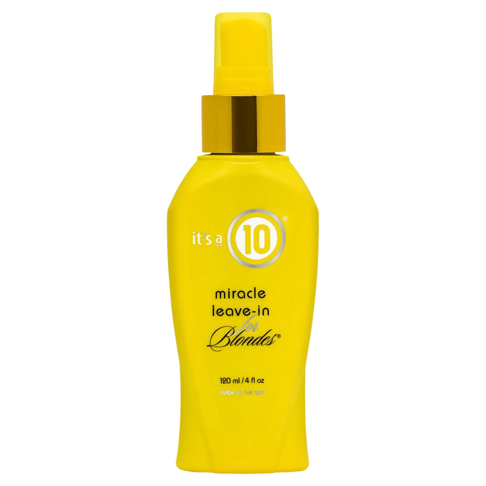 It's A 10 Miracle Leave-In for Blondes that offers your hair all of the amazing hair miracles provided by the original It's A 10 leave-in plus the addition of toning brightness! Those with blonde, grey, or platinum hair often run into unwanted yellow and orange tones sticking to their hair making it dull and discolored. This leave-in spray conditioner contains violet-purple pigments to neutralize that brassiness. Using this detangler restores your hair's naturally bright and shiny appearance. As with any It's A 10 Leave-In the for blondes formulation also provides your hair with frizz protection, and detangling, and is completely color safe.