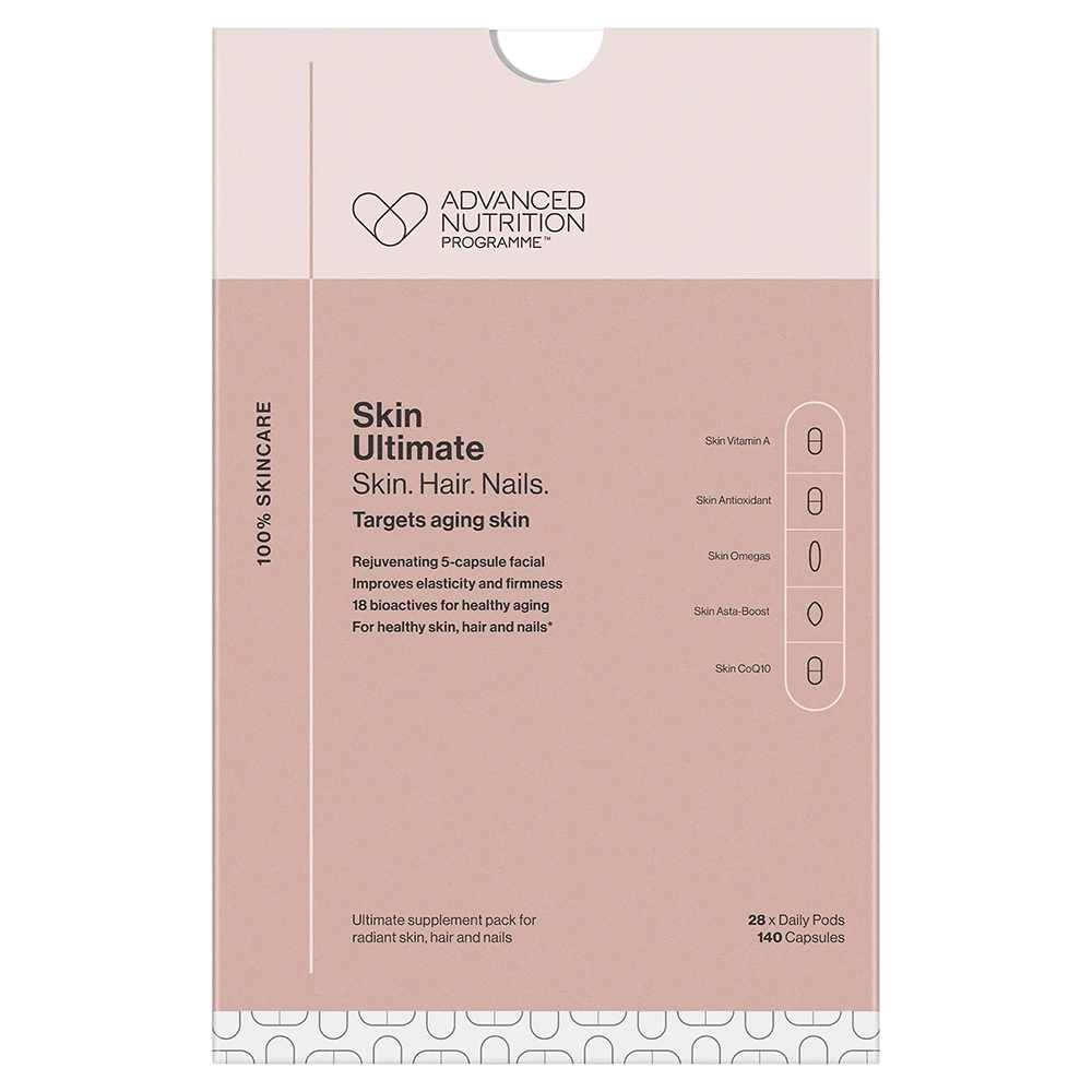 Give your nails, skin, and hair a powerhouse boost with these ultimate skin supplements. The Advanced Nutrition Programme Skin Ultimate Skin Hair Nails features the Jane Iredale Skin Antioxidant, Skin Vitamin A, Skin Omegas, Skin Asta Boost, and Skin CoQ10 in a five-capsule supplement pack designed to nourish, hydrate, and protect skin, hair, and nails! This variety of supplements work together to become one super nutrient solution to nourish, hydrate, and protect your nails, skin, and hair. Skin Ultimate packs work to even out your skin tone, hydrate and plump your skin and keep it rejuvenated and renewed. Reduces the appearance of fine lines and wrinkles and safeguards the skin from external stressors. Beneficial for all skin types and is especially ideal for aging skin, thinning hair, and brittle nails.
