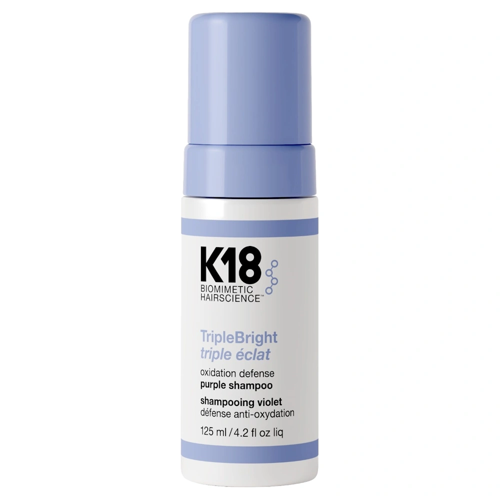 The K18 Biomimetic Hair Science TripleBright Purple Shampoo is a high-performance toning shampoo that is designed to brighten blonde, silver, or lightened hair by neutralizing brassy yellow tones. This shampoo delivers fast, targeted, and long-lasting bright results without over-drying the hair. The K18 Biomimetic Hair Science TripleBright Purple Shampoo is infused with the K18 Peptide, which helps to reduce protein loss and rebuild hair's strength. This shampoo comes out as a foam, making it easy to apply! The K18 Biomimetic Hair Science TripleBright Purple Shampoo in one wash removes up to three months of brass from hard water and helps to defend against future brass with a biopolymer to help prevent reattachment of metals and minerals during washing.
