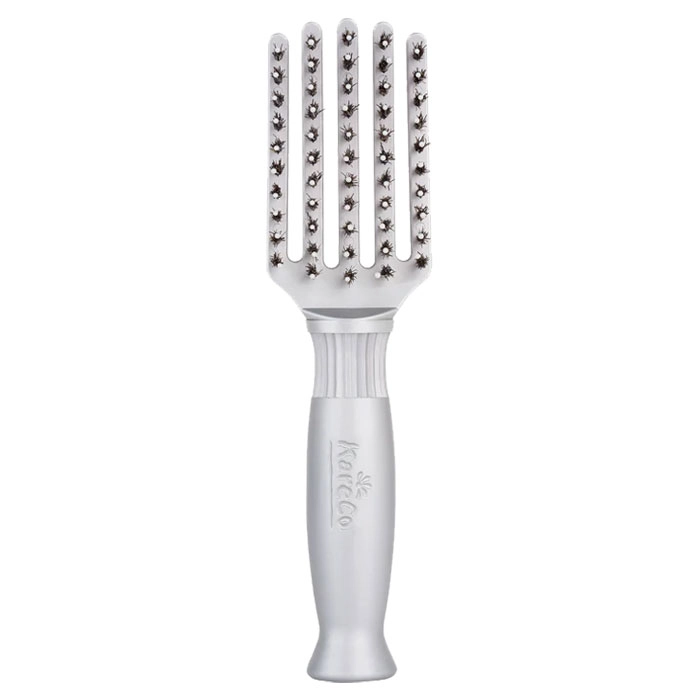 The KareCo Tangle Buster Styler Tiny detangles and adds shine, smooths, and styles while fitting into small spaces. Perfect for your purse or carry-on, this tiny but mighty brush fights tangles while being gentle on hair and scalp. The KareCo Tangle Buster Styler Tiny features dual easy glide nylon and boar bristles that won't snag the hair and help to distribute oils from the scalp down the hair shaft. This helps to rehydrate, recondition, and restore hair's natural moisture balance. The KareCo Tangle Buster Styler Tiny is blow-dry friendly, making it ideal for heat styling. Additionally, this brush features a comfortable non-slip handle for ease of use and is ideal for all hair textures and curl types.