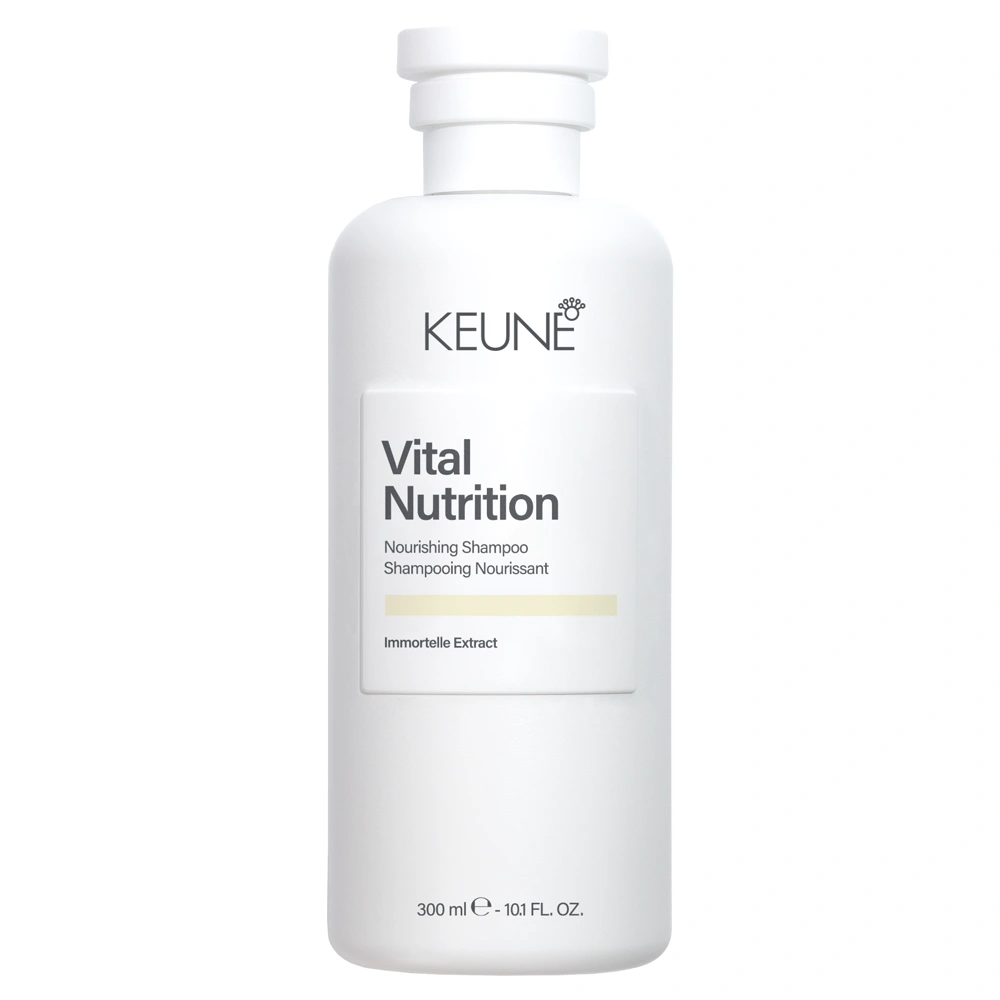 The Keune Vital Nutrition Nourishing Shampoo is a gentle cleansing shampoo that doesn't strip your hair and revives its health. This shampoo provides hair with incredible nourishment, strength, and hydration. This rich and extremely lightweight shampoo is ideal for those with dry, brittle, or dehydrated strands and leaves them feeling strong, silky, and deeply nourished. The Keune Vital Nutrition Nourishing Shampoo is infused with Immortelle Extract and Biomimetic Ceramides. Biomimetic Ceramides are lab-created lipids that are designed to mimic the hair's natural ones and provide major hair benefits. These ceramides repair the hair's cuticle to help lock in moisture and fight dryness and frizz, while additionally strengthening strands and protecting against heat and styling damage. Biomimetic Ceramides leave hair softer, smoother, shinier, and more resilient than ever before. The Keune Vital Nutrition Nourishing Shampoo uses Immortelle Extract, an incredibly strong antioxidant that features regenerative properties. This extract strengthens hair to combat damage and deeply nourishes the hair follicles, protecting strands from oxidative stress. This shampoo protects hair against external aggressors and leaves each and every hair strand healthier than ever before. The Keune Vital Nutrition Nourishing Shampoo leaves hair with a santal spectrum fragrance of warm woody-floral blended with mandarin, jasmine, nutmeg, and sandalwood.