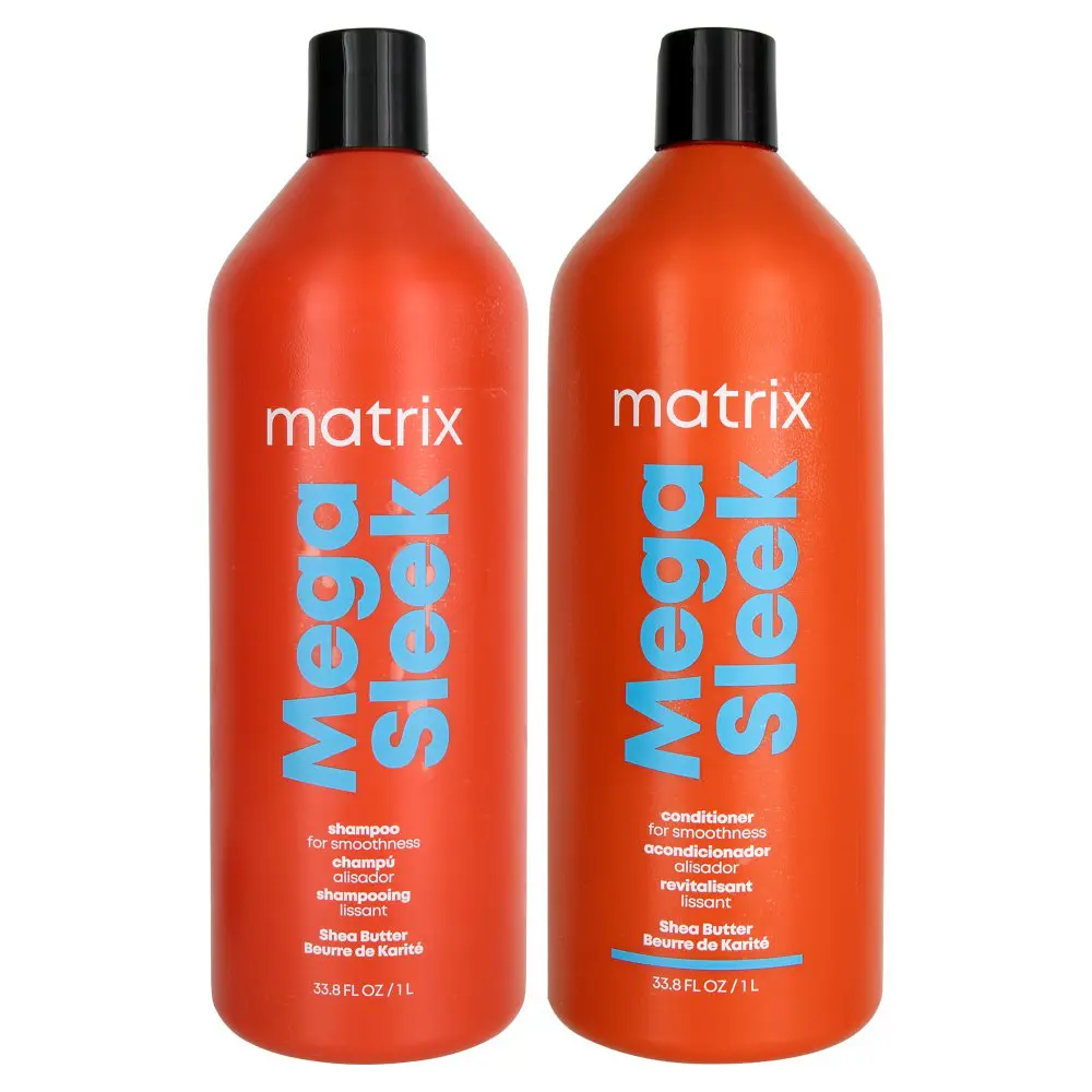 The Matrix Mega Sleek Shampoo & Conditioner Set features a frizz-taming and unruly hair-controlling shampoo and conditioner. The Matrix Mega Sleek Shampoo helps repair damage while cleansing and moisturizing. It optimizes moisture levels and creates a barrier against humidity. The Matrix Mega Sleek Conditioner adds shine, softness, and manageability, making it easy to blow dry hair straight. The Matrix Mega Sleek Shampoo & Conditioner Set is infused with shea butter. Shea Butter is a deeply moisturizing ingredient that softens and smooths the hair's cuticle, adding incredible shine to each strand. It also helps strengthen and repair weak points in hair as it is jam-packed with nutrients like vitamins A and E and essential fatty acids. These help strengthen and protect hair strands and follicles, promoting healthier hair growth. Shea Butter also provides the hair with UV protection, ensuring your hair color remains fresh and vibrant.