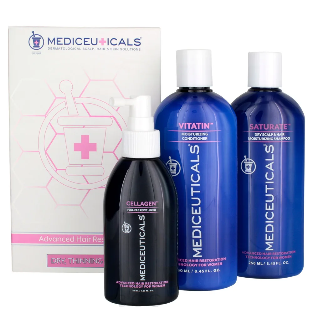 The MEDIceuticals Women's Advanced Hair Restoration Kit for Dry, Thinning Hair is suitable for dry, coarse hair and dry scalp, and is designed to reduce excessive hair loss and thinning. This kit helps to stimulate the production of new hair growth while deeply moisturizing both the hair and scalp. The MEDIceuticals Women's Advanced Hair Restoration Kit for Dry, Thinning Hair features the Saturate Dry Scalp & Hair Moisturizing Shampoo, Vitatin Moisturizing Conditioner, and the Cellagen Follicle Revitalizer. This powerful trio helps to deeply cleanse, hydrate, condition, and revive the hair and scalp. The Cellagen Follicle Revitalizer additionally helps to stimulate the scalp, promoting blood flow and a healthy scalp environment. With the MEDIceuticals Women's Advanced Hair Restoration Kit for Dry, Thinning Hair, you will begin to notice less hair fall-out, a better scalp, and overall healthier hair strands.