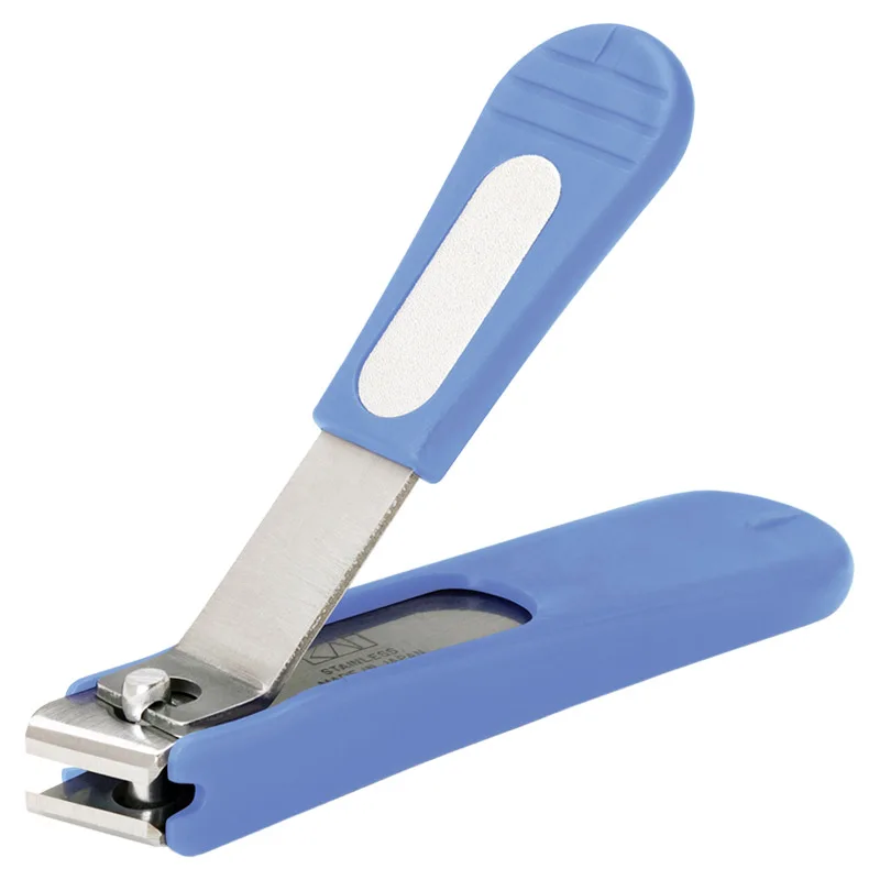 Patented, heavy-duty wide jaw stainless steel toenail clippers designed to cut thicker toenails. Straight edge blades are ergonomically designed at an angle for ease of use. Handle can be adjusted for right or left handed use. Includes one built-in file and clipper catcher.