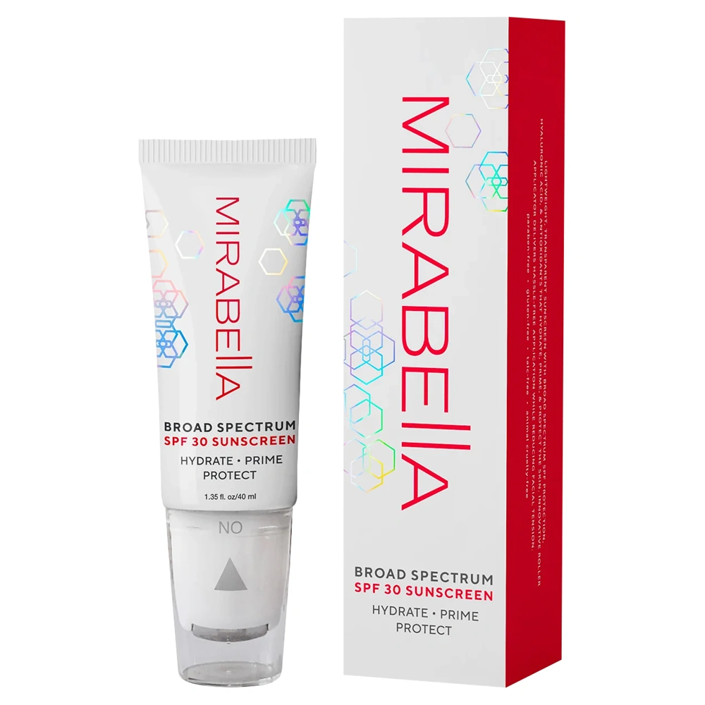 Visibly blur the appearance of fine lines, pores, and wrinkles while protecting your skin with the Mirabella Broad Spectrum SPF 30 Sunscreen. This broad spectrum SPF 30 features an ultra-lightweight formula that shields skin from harmful UV rays and sun damage. This 2-in-1 product is the perfect addition to simplify your beauty routine, helping to protect, prime, and hydrate your skin in one simple step! The Mirabella Broad Spectrum SPF 30 Sunscreen is infused with hyaluronic acid and powerful antioxidants, including Aloe Vera Gel, Vitamin C, Green Tea Extract and so many more! Antioxidants help to shield and protect skin from environmental stressors. This SPF additionally contains anti-aging ingredients like Watermelon Extract, Rosemary Extract, Vitamin E, and Hyaluronic Acid. Lastly, the Mirabella Broad Spectrum SPF 30 Sunscreen is infused with Homosalate and Octisalate to provide the skin with UVB protection, while Avobenzone provides UVA protection. This SPF's nourishing formula dries to a clear finish and features a convenient rollerball applicator that makes applying this SPF a breeze! The Mirabella Broad Spectrum SPF 30 Sunscreen is formulated without Talc, Gluten, or parabens and is cruelty-free!