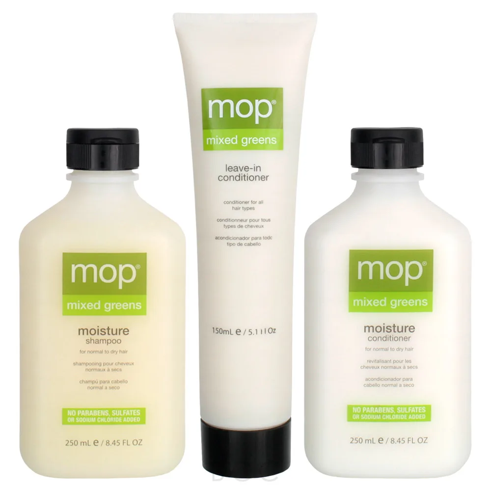 MOP Mixed Greens Moisture Shampoo: Apply a quarter-size amount of mop mixed greens shampoo to wet hair. Massage into hair and scalp and work into a rich lather. Rinse thoroughly and repeat if necessary. Follow with mop mixed greens conditioner.