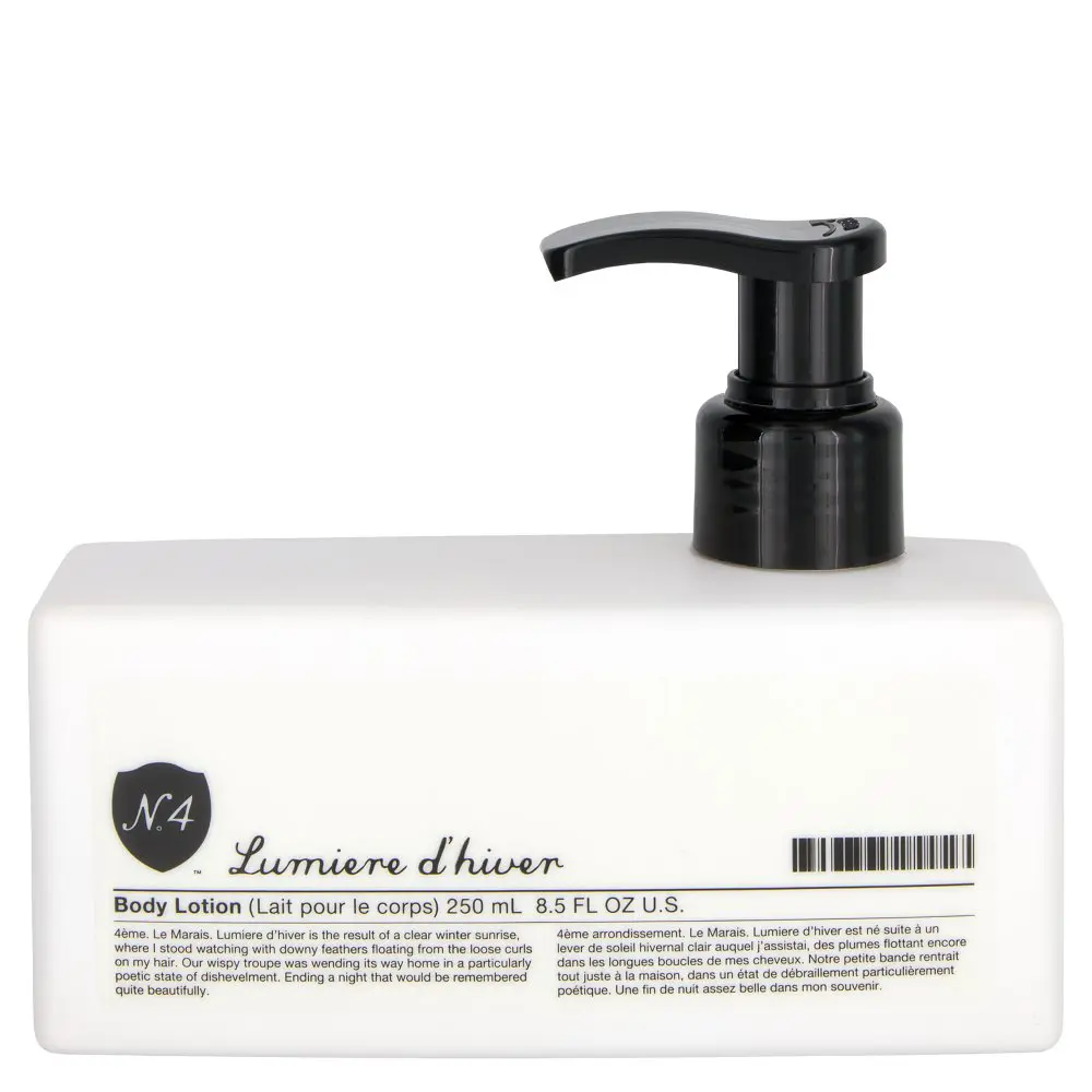 Moisturize and hydrate skin to a new level with Lumiere d'hiver Body Lotion. Made with Shea Butter and Aloe; this lotion helps soothe dry irritated skin, soften and smooth. With its light weight formula Lumiere d'hiver Body Lotion absorbs into the skin quickly without leaving a heavy feel behind. Fresh fragrance of White Freesia, Golden Amber and Warm Musk.