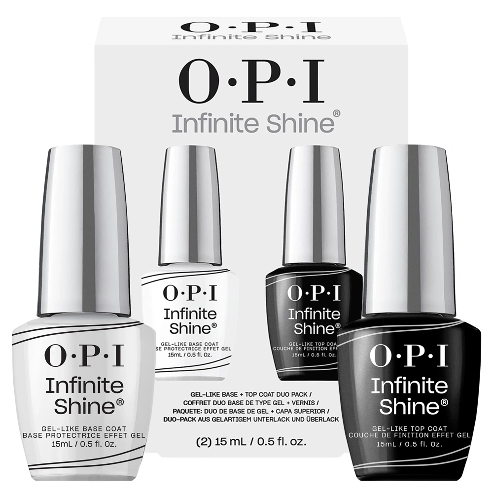 The OPI Infinite Shine - Base & Top Duo Pack is a must-have, long-lasting base and top coat duo that is designed to lock in your nail color, without the worry of chipping, staining, or scratching! The OPI Infinite Shine Gel-like Base Coat grips nails, creating the perfect foundation for any Infinite Shine polish shade of your choosing, while the OPI Infinite Shine Gel-like Top Coat creates a gel-like plumping effect that seals the nail's free edge. The OPI Infinite Shine - Base & Top Duo Pack provides your nails with intense shine, protection from daily wear and tear, and locks in your manicure's vibrancy.