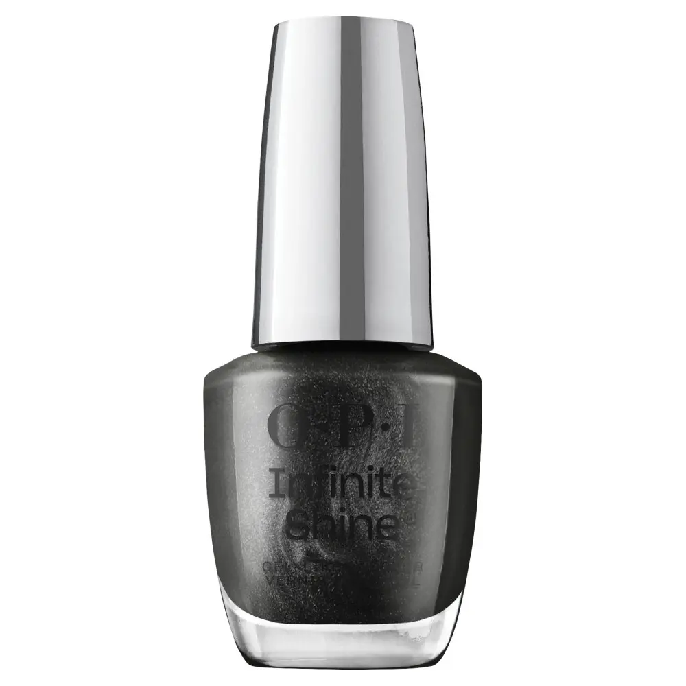 Midnight black shimmer polish. The OPI Infinite Shine - Stay & Night is a creamy, gel-like black nail polish that knows how to make an entrance. OPI's Infinite Shine nail lacquers are crafted with high-impact pigments that keep the color rich and true to its shade. Prolongs your mani-pedi and gives a beautiful, brilliant shine! The OPI Infinite Shine - Stay & Night is part of the three-step process for OPI's long-lasting nail polish line that provides nails with a gel-like high-shine finish and up to 11 days of wear time.