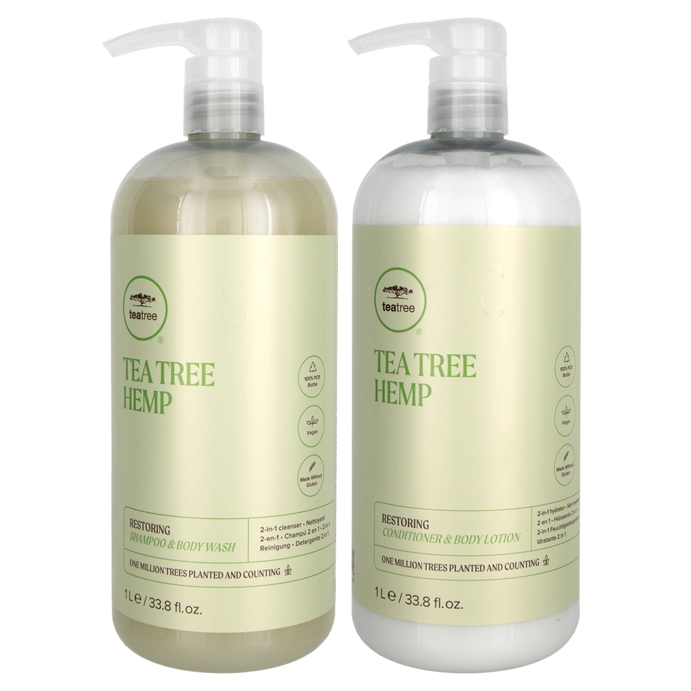 Includes Tea Tree Hemp Restoring Conditioner & Body Lotion 33.8 oz & Tea Tree Hemp Restoring Shampoo & Body Wash 33.8 oz