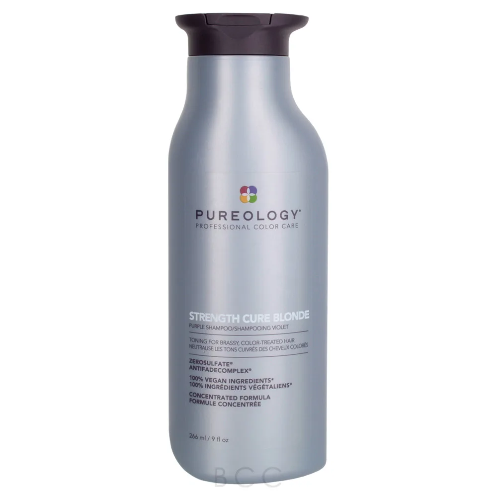 The Pureology Strength Cure Blonde Purple Shampoo is a shampoo designed with violet pigments and Pureology's exclusive AntiFade Complex to tone and neutralize brassiness in blonde hair. This complex is formulated with Sunflower Seed, a UV Filter, and Vitamin E to fight color-depleting environmental effects while ensuring lasting shine. This shampoo also uses plant-based protein Keravis to strengthen strands and prevent damage while the powerful antioxidant Astaxanthin helps heal and repair. Bright Purple Orchid not only provides natural violet toning properties but also softens hair strands. The Pureology Strength Cure Blonde Purple Shampoo leaves fragile, over-processed hair strengthened and renewed. It features an intoxicating scent of fruity Pear and soft, floral Rose is finished with just a touch of Sandalwood.