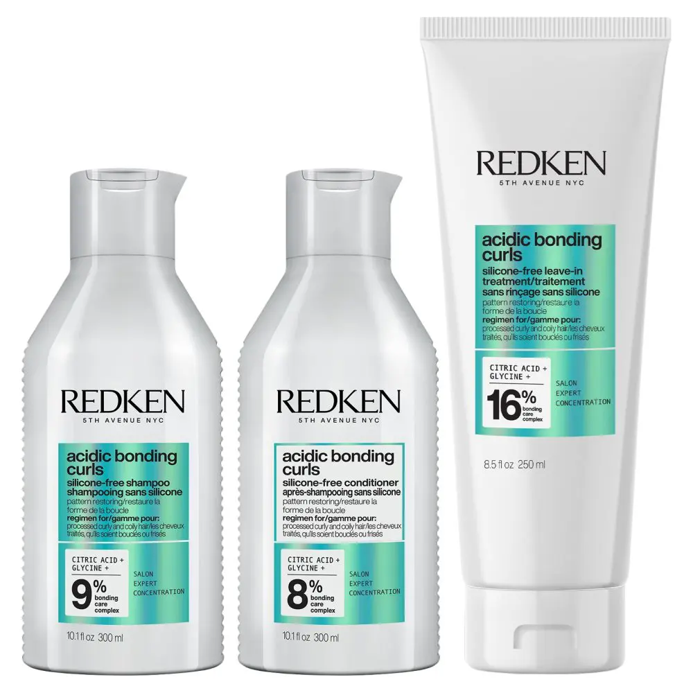 The Redken Acidic Bonding Curls Trio features the Redken Acidic Bonding Curls Silicone-Free Shampoo, Conditioner, and Leave-In Treatment to help you achieve healthy, hydrated, and well-defined curls and coils. This powerful trio of curly care products is designed to help rebuild broken bonds within the hair fiber, making strands less prone to breakage, split ends, and unwanted frizz. The Redken Acidic Bonding Curls Silicone-Free Shampoo instantly helps remove build-up on the hair and scalp while remaining gentle on fragile curls and coils. This silicone-free and sulfate-free shampoo is infused with avocado oil, coconut oil, and shea butter, as well as Redken's Curl-Bond Technology to help repair damaged curls and coils while also providing them with intense hydration and curl definition. The Redken Acidic Bonding Curls Silicone-Free Conditioner is designed to help restore your hair's natural curl pattern to even the most damaged curls and coils. The curlier your hair is, the more bonds it contains, making it more prone to breakage and damage. This conditioner works in tandem with the shampoo to build and repair those bonds, helping to strengthen curls from the inside out! After cleansing and conditioning, follow up with the Redken Acidic Bonding Curls Silicone-Free Leave-In Treatment. This powerful leave-in is designed to protect and restore the pattern of damaged curls and coils, making them healthier, stronger, smoother, and more conditioned than ever. The Redken Acidic Bonding Curls Silicone-Free Leave-In Treatment provides the hair with 450 degrees of thermal protection and 72-hours of curl-defining and hydrating power. In addition, this leave-in treatment reduces hair frizz and improves the hair's elasticity. This power-house trio is infused with avocado oil, coconut oil, and shea butter, as well as Redken's Curl-Bond Technology to help repair damaged curls and coils while providing intense hydration and curl definition. Redken's Curl-Bond Technology is powered by citric acid, glycine, and urea, which drive deeply into the hair follicle to build bonds and repair curl strength from the inside out, while avocado oil, coconut oil, and shea butter coat the hair to diminish frizz and provide curls with long-lasting hydration and elasticity.