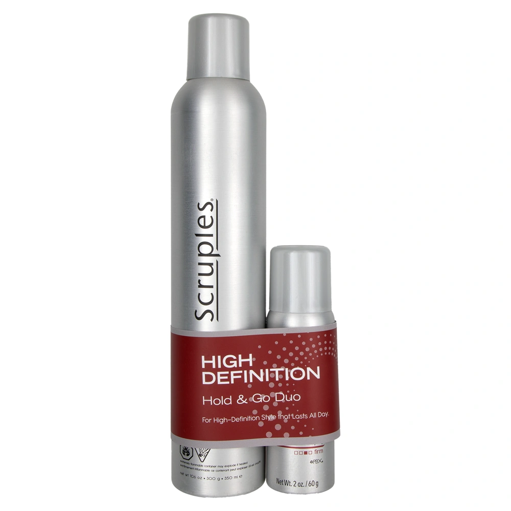 The Scruples Hold & Go Holiday Duo features the Scruples High Definition Hair Spray in two different sizes, allowing you to create firm-holding styles no matter where you go this holiday season. This finishing spray is ideal for all hair types and textures and provides styles with lift, volume, and control.