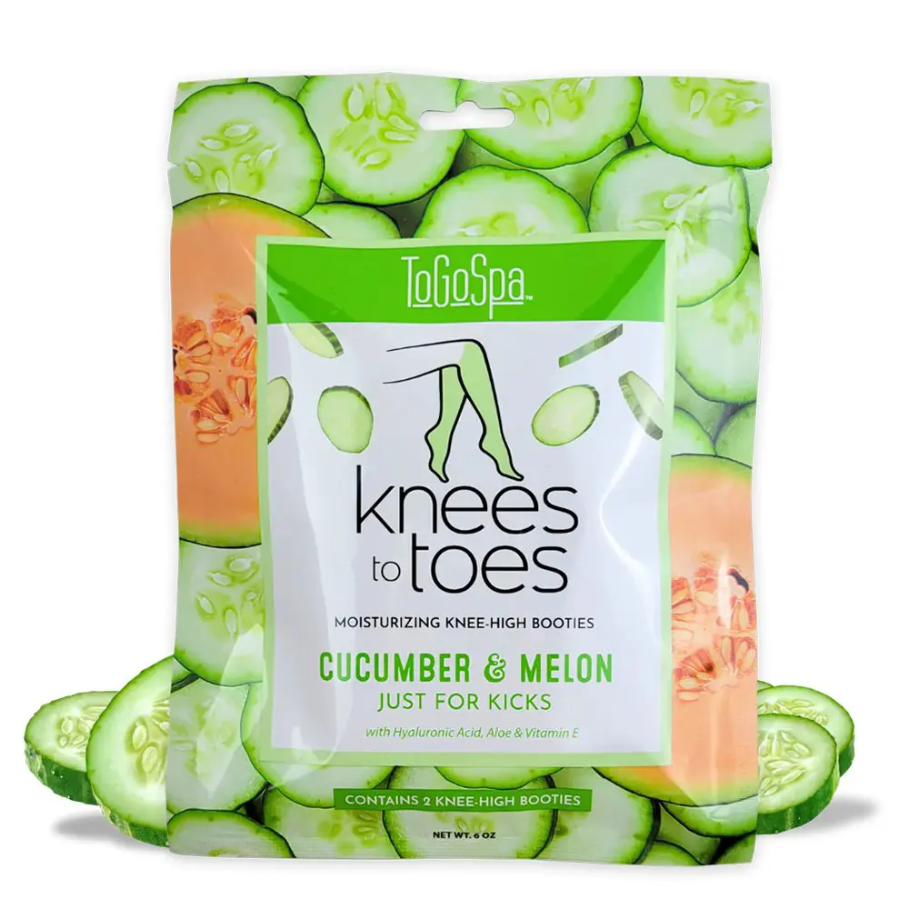 The ToGoSpa Knees to Toes Moisturizing Knee-High Booties - Cucumber & Melon is infused with soothing cucumber, vitamin-rich melon, and aloe to help deeply hydrate and nourish the skin. This mask provides the skin with a cooling and soothing relief that makes it ideal for dry and tired legs and feet. The ToGoSpa Knees to Toes Moisturizing Knee-High Booties - Cucumber & Melon features a gentle aroma of Cucumber Melon that will transport your senses back to the 90's! Just simply apply the mask for 15-30 minutes to see an overall improved texture and appearance of both your feet and legs. In addition to cucumber, melon, and aloe, the ToGoSpa Knees to Toes Moisturizing Knee-High Booties - Cucumber & Melon also includes vitamin E, jojoba seed oil, and glycerin to thoroughly hydrate and revive overly dry and tired skin.