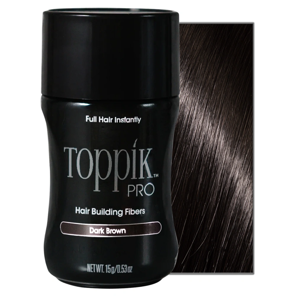The Toppik Pro Hair Building Fibers in dark brown are made from pure organic Keratin Protein, the same protein found in human hair, and are designed to blend seamlessly with existing hair strands. These fibers give hair a thicker, fuller appearance. They are available in a variety of different shades, matching any hair color and covering both grey roots and color-treated hair regrowth. The dark brown option is ideal for those who have dark brown hair. The Toppik Pro Hair Building Fibers are electrostatically charged to form a magnetic attraction with your existing hair, providing a secure bond that won't budge until the hair is washed. These fibers are additionally Colorfast, meaning they won't run or rub off on clothing or your pillows. The Toppik Pro Hair Building Fibers are ideal for anyone looking to thicken up their style and conceal unwanted visible scalp.