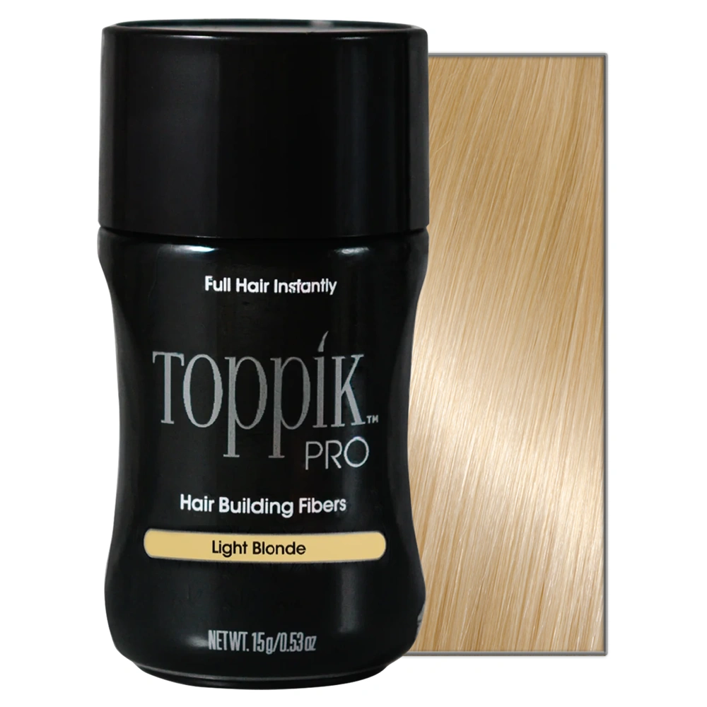 The Toppik Pro Hair Building Fibers in light blonde are made from pure organic Keratin Protein, the same protein found in human hair, and are designed to blend seamlessly with existing hair strands. These fibers give hair a thicker, fuller appearance. They are available in a variety of different shades, matching any hair color and covering both grey roots and color-treated hair regrowth. The light blonde option is ideal for those who have platinum to light blonde hair. The Toppik Pro Hair Building Fibers are electrostatically charged to form a magnetic attraction with your existing hair, providing a secure bond that won't budge until the hair is washed. These fibers are additionally Colorfast, meaning they won't run or rub off on clothing or your pillows. The Toppik Pro Hair Building Fibers are ideal for anyone looking to thicken up their style and conceal unwanted visible scalp.