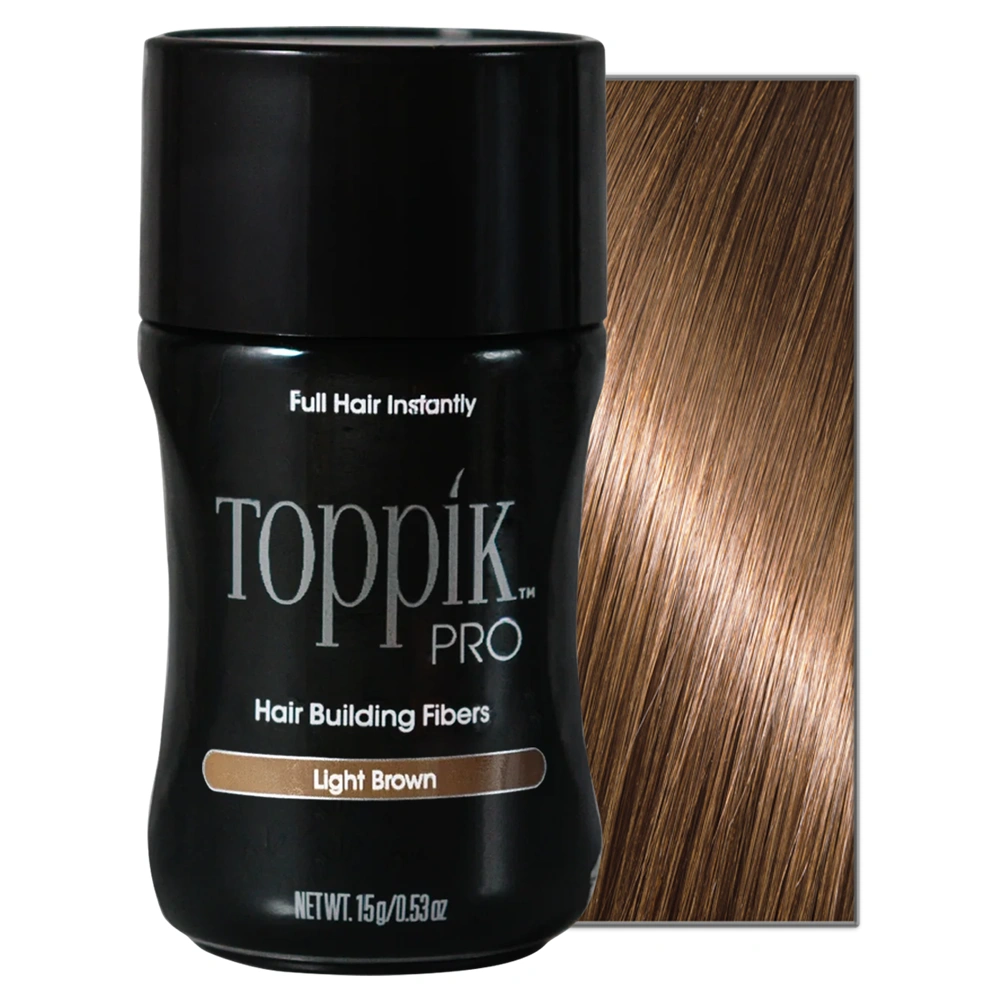 The Toppik Pro Hair Building Fibers in light brown are made from pure organic Keratin Protein, the same protein found in human hair, and are designed to blend seamlessly with existing hair strands. These fibers give hair a thicker, fuller appearance. They are available in a variety of different shades, matching any hair color and covering both grey roots and color-treated hair regrowth. The light brown option is ideal for those who have bronde, caramel, or light brown hair. The Toppik Pro Hair Building Fibers are electrostatically charged to form a magnetic attraction with your existing hair, providing a secure bond that won't budge until the hair is washed. These fibers are additionally Colorfast, meaning they won't run or rub off on clothing or your pillows. The Toppik Pro Hair Building Fibers are ideal for anyone looking to thicken up their style and conceal unwanted visible scalp.