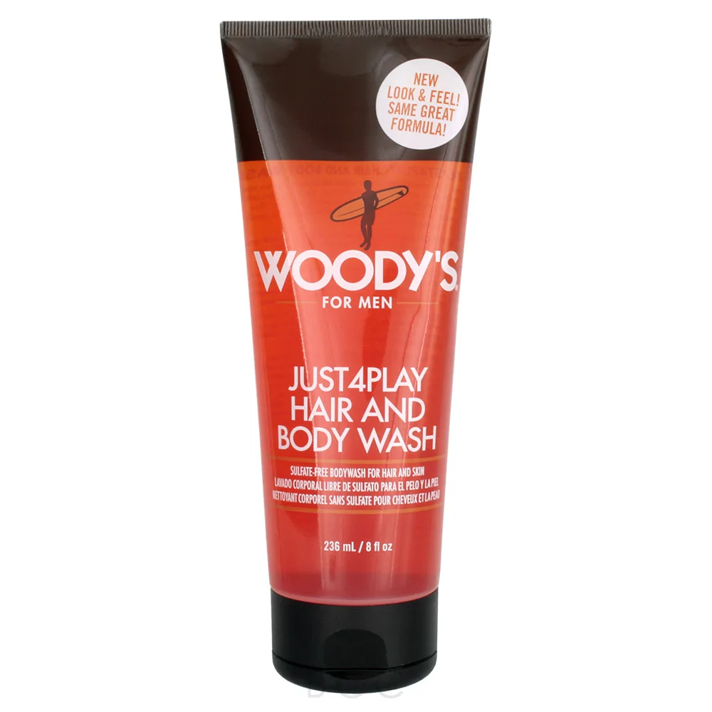 Woody's Just4Play Body Wash is a rich, creamy, sulfate-free lathering hair and body wash. This wash combines with a macro moisture complex to help eliminate dry, irritated skin and dull, lifeless hair. This complex infuses the skin with deep moisturizers that nurture and soothe the skin with a special blend of extracts equally beneficial for skin and scalp. The Woody's Just4Play Hair And Body Wash additionally includes Horse Tail Extract, Butterfly Ginger Root Extract, Rosemary Leaf Extract, Nettle Extract, and Yucca Vera Leaf/Root Extract. These extracts cleanse and condition your hair, without drying it out! With the Woody's Just4Play Hair And Body Wash, skin will feel refreshed from the inside out while your hair takes on a new body and shine. This unique experience is enhanced with the Just4Play fragrance.